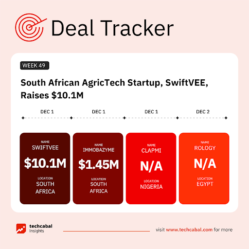 SwiftVEE, a South African Agrictech startup, raised $10.1 million in a series A funding round. African venture capital firm HAVAÍC led the round with participation from Exeo Capital, Mike Kirsten and Carlo Dickson, and Zire Africa. (Dec 1)