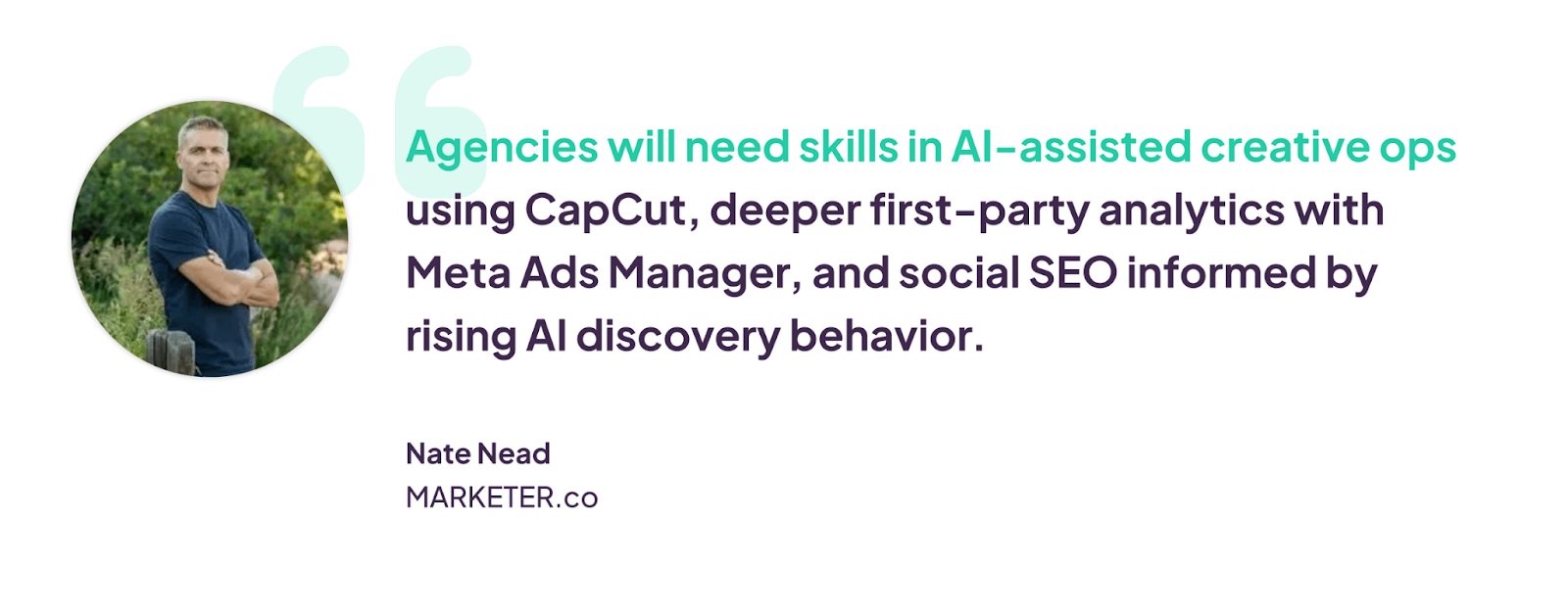 “Agencies will need skills in AI-assisted creative ops using CapCut, deeper first-party analytics with Meta Ads Manager, and social SEO informed by rising AI discovery behavior. The biggest challenge will be balancing authenticity with scale, because audiences reward volume only when the storytelling still feels human, and that tension — not tech access — will define the winners next year.” – Nate Nead, CEO, MARKETER.co