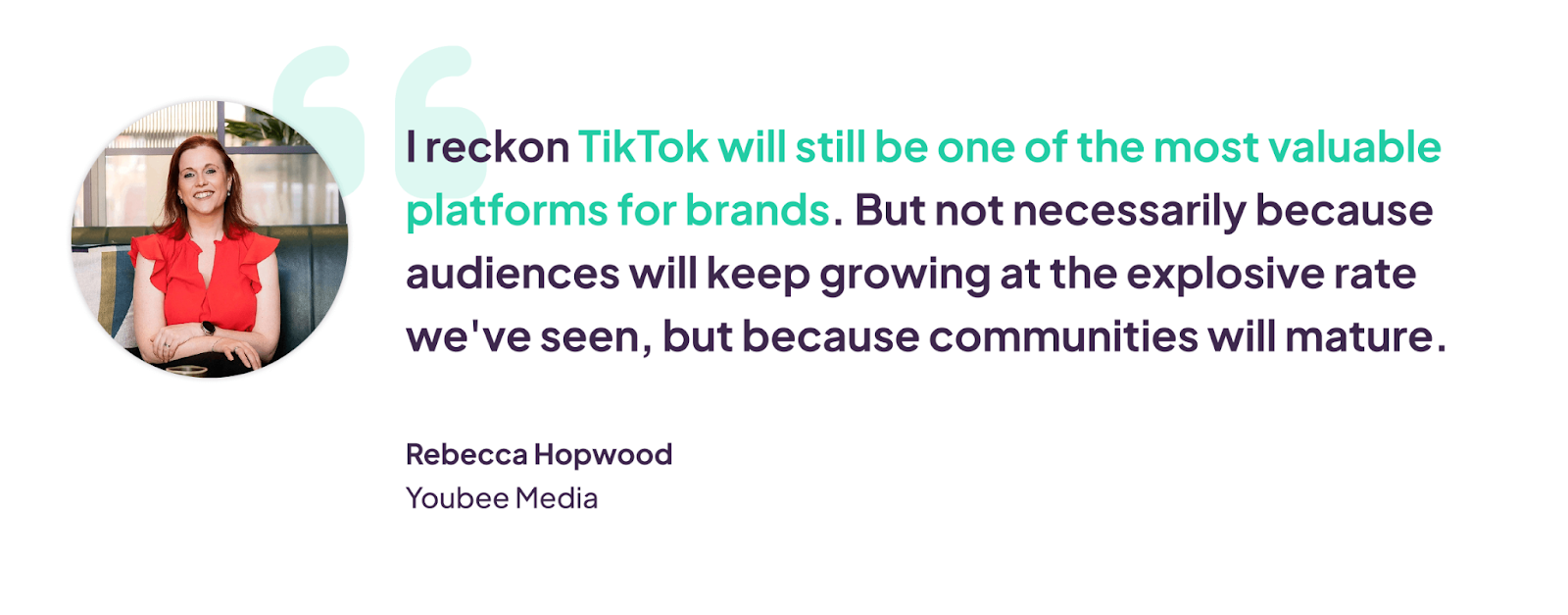 “I reckon TikTok will still be one of the most valuable platforms for brands. But not necessarily because audiences will keep growing at the explosive rate we’ve seen, but because communities will mature. Brands will finally get clearer about who they’re talking to and why. They’ll know what they’re bringing to the table, what “value” actually means for their audience, and where TikTok fits in the bigger picture of awareness and reach.” – Rebecca Hopwood, Founder and Director, Youbee Media