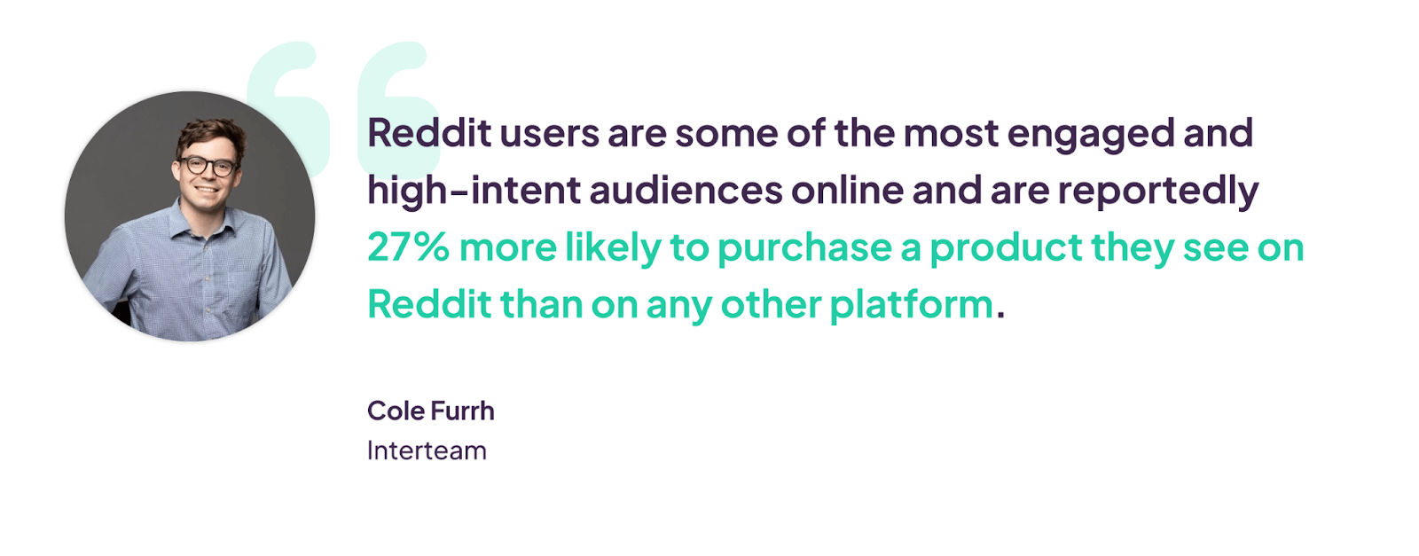 “Reddit users are some of the most engaged and high-intent audiences online and are reportedly 27% more likely to purchase a product they see on Reddit than on any other platform. Combine that with far lower CPCs than on almost any other platform, and you have a recipe for scaled growth.”
