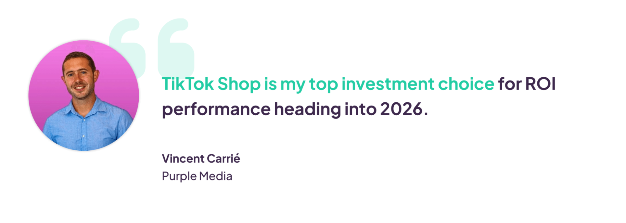 “TikTok Shop is my top investment choice for ROI performance heading into 2026. One of our fashion clients tripled monthly e-commerce sales within a few weeks of launching on TikTok Shop while using half the budget typically required for Meta ads. The platform offers a powerful mix of discovery features combined with immediate purchase capabilities.” – Vincent Carrié, CEO, Purple Media