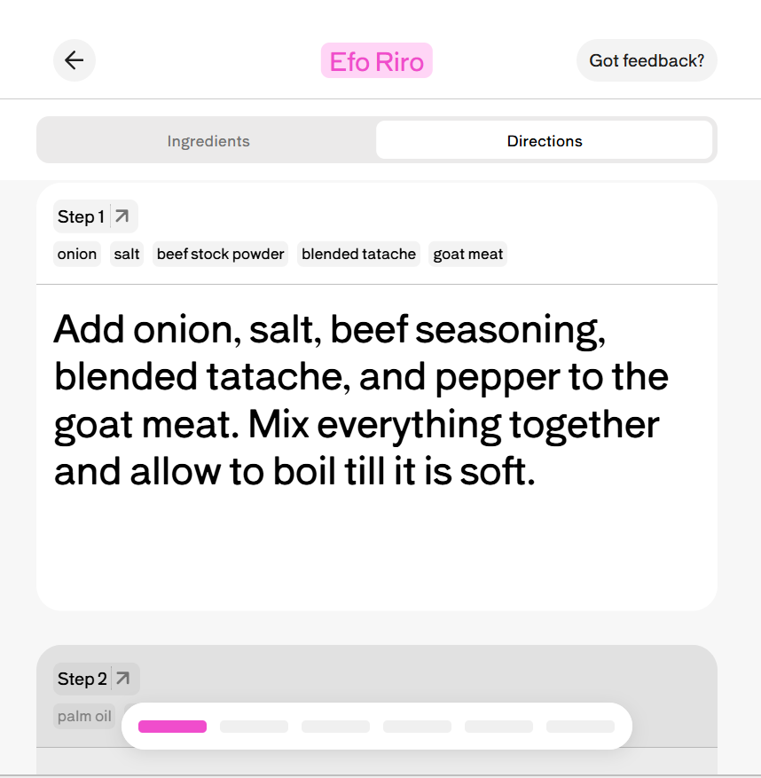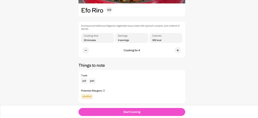 The web app indicates potential allergens in the meal, a countdown timer for every step (as indicated in the video), with ingredients listed for every step of the recipe. Based on your location, the web app also shows stores nearby where you can purchase ingredients from.