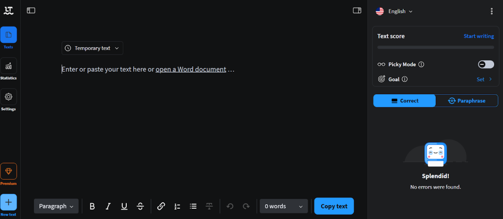 LanguageTool is an AI-powered grammar checker that helps maintain consistency in your written pieces. While it has a paid version, the free tier serves as a basic writing editor. It detects errors as you write and suggests revisions, as well as ways to paraphrase your sentences.