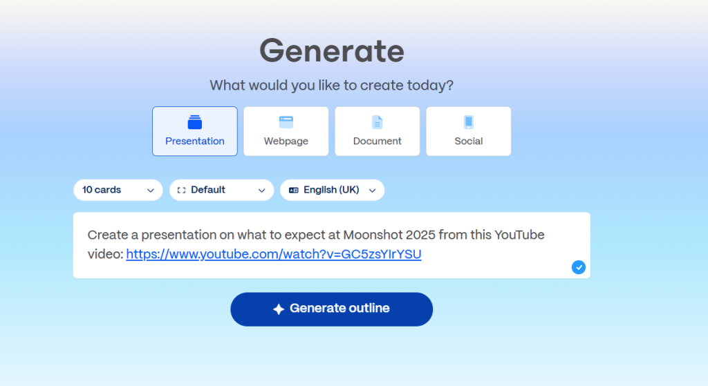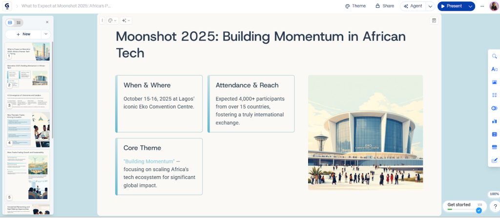 I asked Gamma to generate a deck from a YouTube trailer for the Moonshot 2025 conference by , and allowed it by default to generate its 2D illustrations. The web app also lets you prompt an image for each slide of the deck.