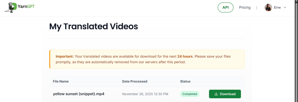 YarnGPT is an AI-powered translator for Nigerian indigenous languages. You can use the ‘Video translate’ feature to translate the languages spoken in the videos to any of the three major languages: Hausa, Yoruba, or Igbo. Currently, the feature is in beta mode and supports files up to 100 MB and 10 minutes in length.