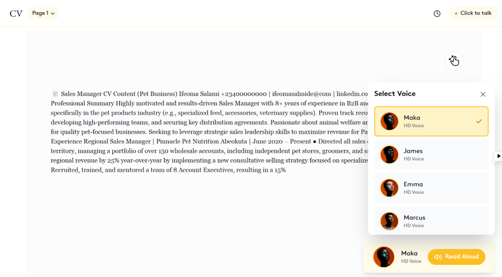 To demo the app, I threw in a CV drafted by Google’s AI model, Gemini and asked it to read it back to me. SerenDPT also allowed me to engage and speak with the AI. While it has different pricing tiers, the starter plan gives room for one reader voice, inputting the LLM with 5,000 words a month, and 30 Q&A prompts.