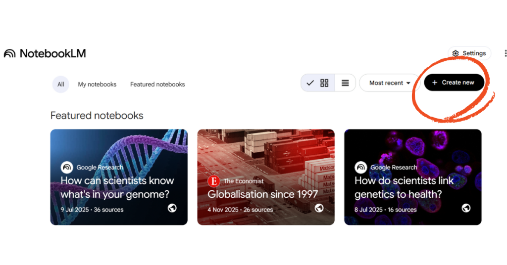 Google’s Notebook LLM also allows you to create flashcards from an information set. To use this feature, create a new notebook and upload your sources.