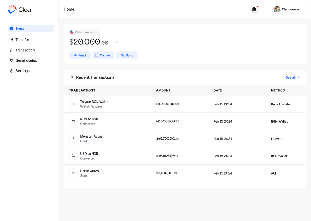 Clea operates through a wallet-based system and enables users to fund a wallet in Naira, convert to dollars using stablecoins, and then send money to foreign suppliers across multiple countries.
