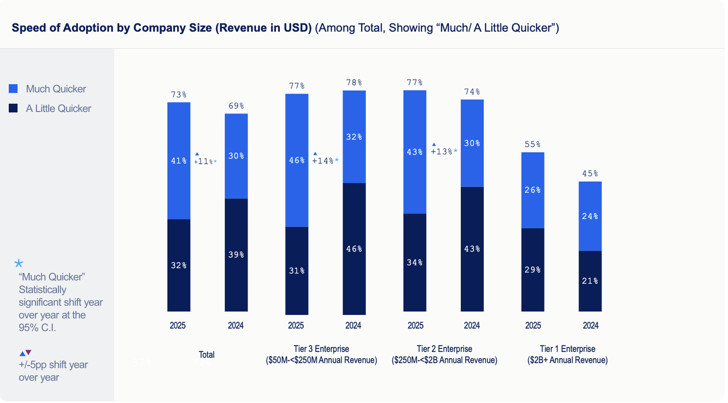 - Adoption Speed: 56% of VP-level and higher leaders believe their organization is adopting Gen AI “much quicker” than competitors. Only 28% of mid-level managers share that level of confidence.