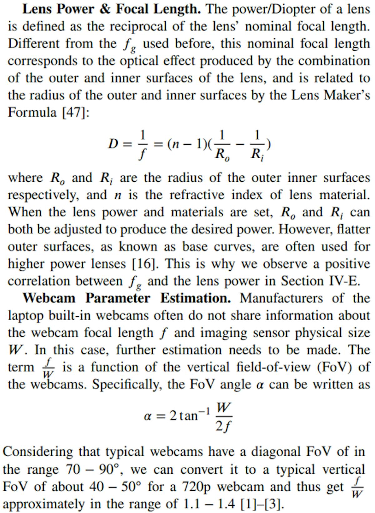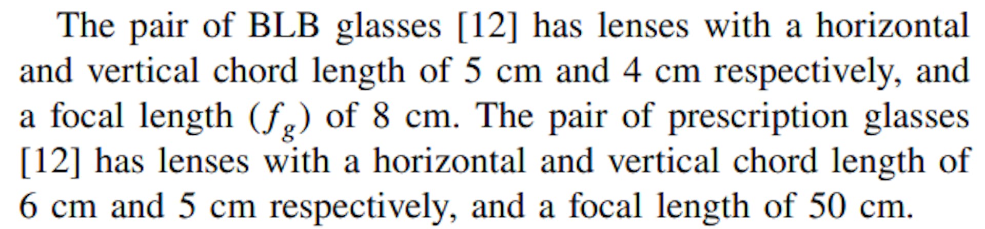 Fig. 11. Design conventions suggest that eyeglasses with higher prescription strength have smaller curvature (larger radius/focal length) on the lens outer surface, leading to larger-size reflections. Besides curvature and reflectance, lens coating conditions can also affect reflection quality.Fig. 11. Design conventions suggest that eyeglasses with higher prescription strength have smaller curvature (larger radius/focal length) on the lens outer surface, leading to larger-size reflections. Besides curvature and reflectance, lens coating conditions can also affect reflection quality.