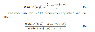 Recommendation Relational Inner Product Association (R-RIPA). We also provide a metric, R-RIPA, that is similar to the prior metrics, but parameterized by a userdefined attribute bias direction. This provides more flexibility for the practitioner to use computed attribute association bias vectors based on SVC and PCA, or other user-defined attribute directions in general. Additionally, this metric may be more robust to fluctuations or outliers that can affect metrics heavily reliant on group averages over entities. We base this metric on RIPA [27], which is calculated with a relation vector representing the first principal component of the difference between word pairings in an attributedefining set. We modify RIPA to require a relation vector 𝜓 that represents a user-defined attribute bias direction between 𝐴 and 𝐵. R-RIPA for an entity set 𝐸 is computed as: