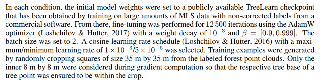The model framework used in this study is TreeLearn (Henrich et al., 2023). It employs the widelyused grouping-based paradigm (Qi et al., 2019) for instance segmentation: The point cloud is processed using a 3D-UNet followed by pointwise semantic and offset prediction. The semantic prediction is used to classify points as tree or non-tree. The offset prediction aims to shift each point towards the respective tree base a point belongs to. After applying the predicted offset to each point, tree instances can be identified using density-based clustering. To account for memory limitations, the authors proposed a sliding window approach with subsequent merging of the results.