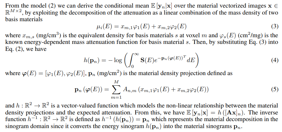 An alternative approach is based on decomposing the high and low energy sinogram into two independent measurements which correspond to a single basis material. Different approximations of the decomposition function that convert the dual energy sinograms into materials independent sinograms have been proposed in Alvarez and Macovski [1976]. Afterwards each material sinogram is converted into the image domain using model-based optimization methods Mechlem et al. [2018] with spatial regularization.