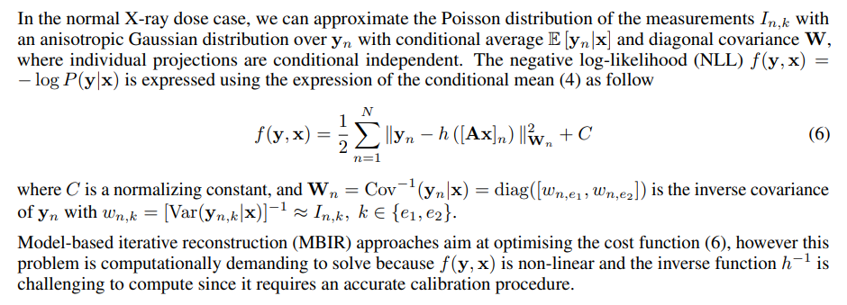 Recently, other works have exploited the paradigm of combining deep learning and the knowledge of the physics of the DECT model within the optimisation problem. The one-step material decomposition is implemented using supervised unrolling algorithms in Eguizabal et al. [2022], Perelli and Andersen [2021] or using the Noise2Inverse framework which uses pair of sub-sampled noisy sinograms and training dataset Fang et al. [2021]. One limitation of these methods is the computational cost of the iterative solver which hinders the usage in applications which require strict time constraints.