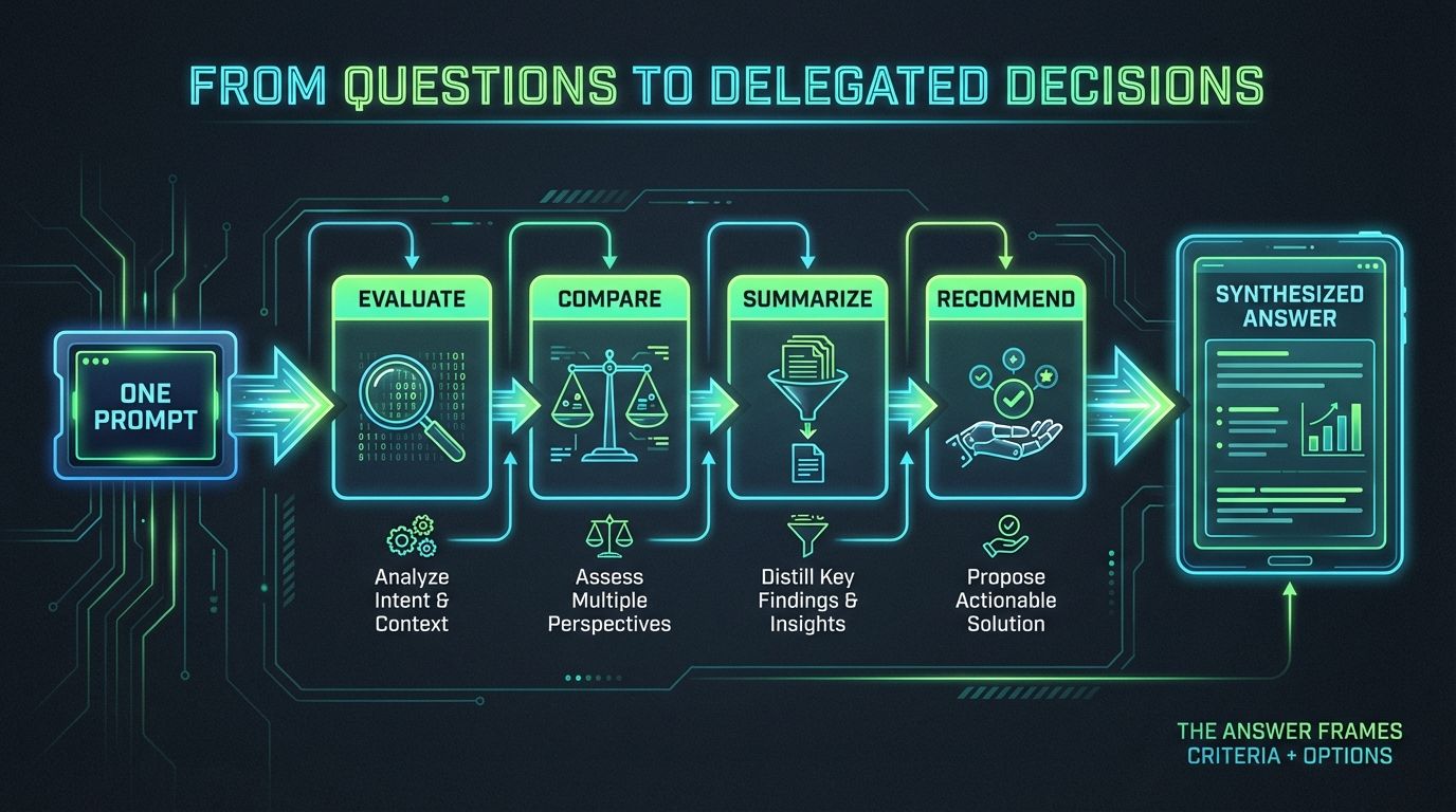 According to OpenAI, users are no longer interacting with AI primarily through simple questions, but through [multi-step, task-oriented prompts]() that ask systems to analyze, compare, summarize, and recommend—often in a single interaction. In its research on how people use ChatGPT, OpenAI shows a clear shift from lookup behavior to delegated reasoning and decision support. n