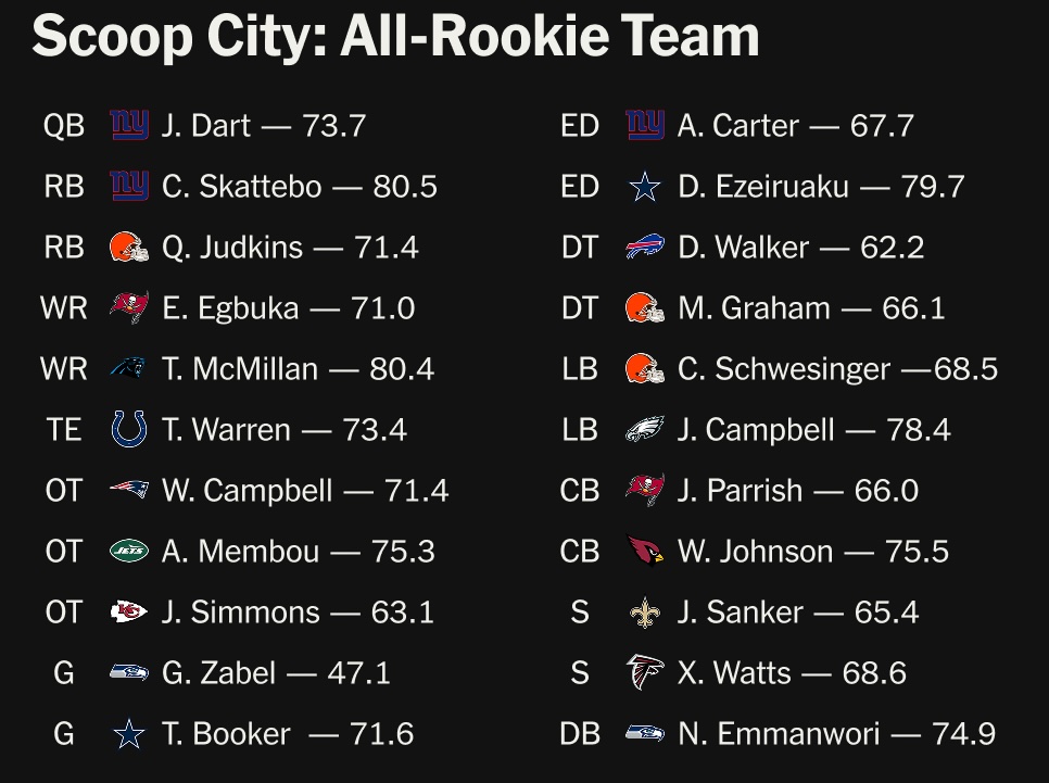 Fair or not, Sanders was arguably the most well-known prospect of 2025. He’s certainly not the best. For the top rookies, check out Dane Brugler’s mid-season All-Rookie team, and I’ll note that the Giants’ fourth-round running back Cam Skattebo is PFF’s highest-rated first-year player. 👀