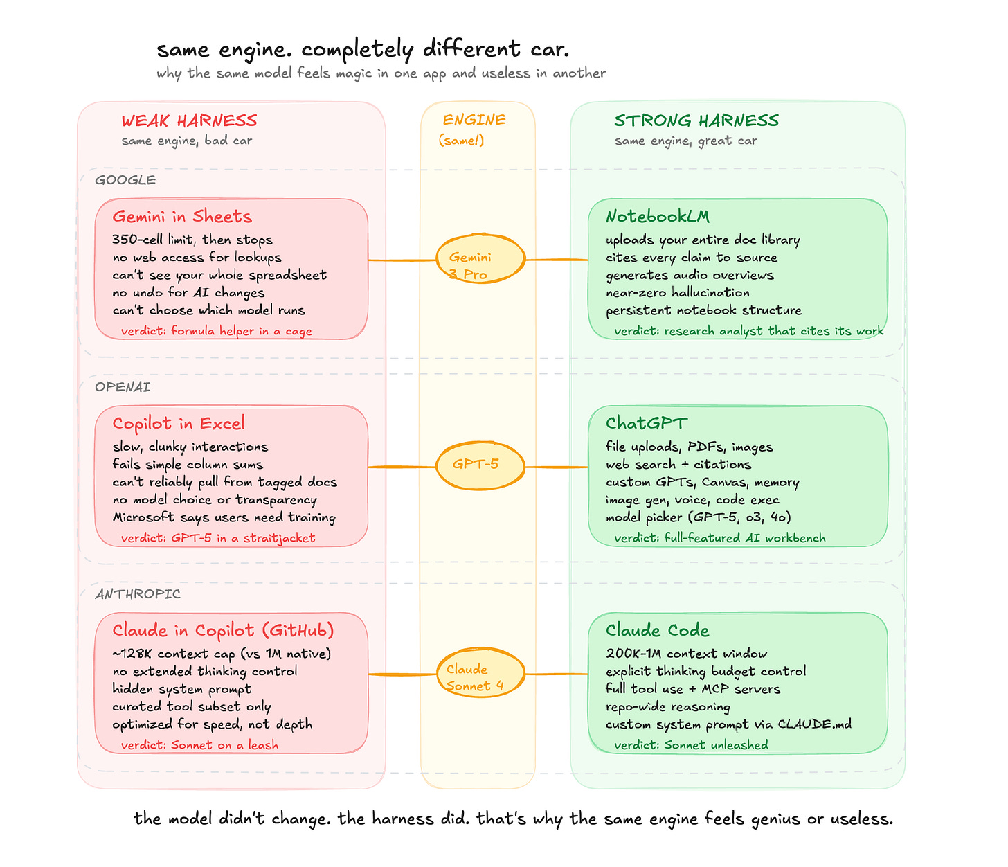 if you’re picking tools: stop asking “which model does it use?” start asking: what can it read? what can it do with my files? does it remember me? how long can it focus? how does it handle mistakes? those are harness questions. that’s why the same model feels magic in one app and useless in another.