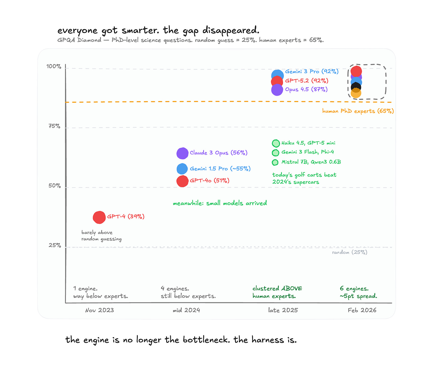 take GPQA Diamond — 198 PhD-level science questions where human experts score about 65%. in November 2023, GPT-4 scored 39% — barely above a coin flip. one engine, mediocre.