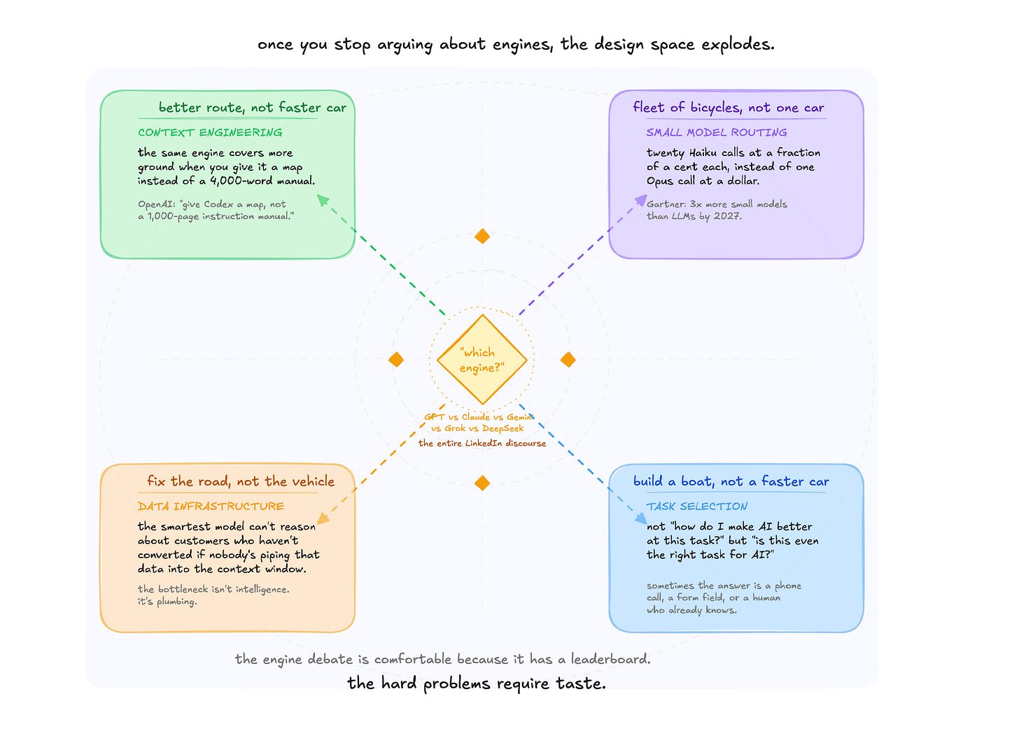 the engine debate is comfortable because it has a leaderboard. it’s measurable. it updates every week. but the hard problems, the ones where AI actually transforms a business, are all harness problems, road problems, route problems. they don’t have benchmarks. they require taste.