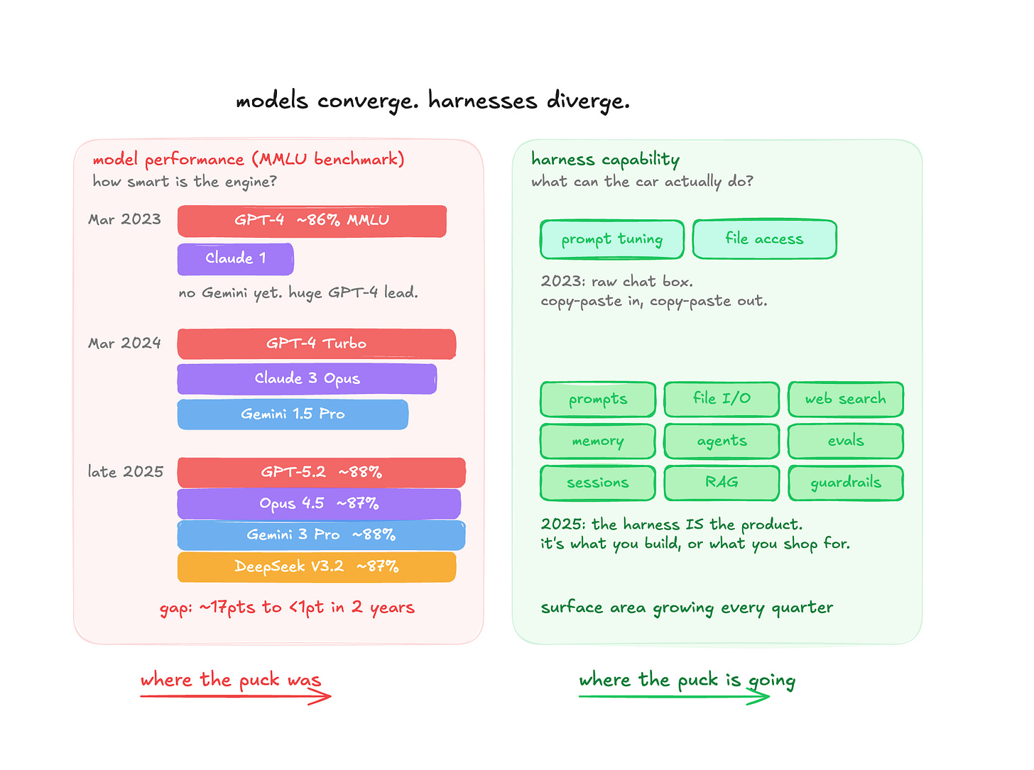think of AI as a car. the model (GPT, Claude, Gemini, Grok, DeepSeek) is the engine. the harness is the rest of the car — steering, brakes, fuel system, navigation, trunk.