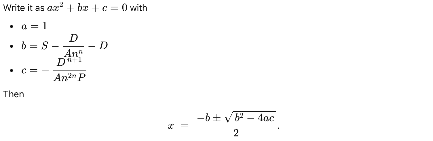 x^2 + (S - D/(A*n^n) - D)*x - D^(n+1)/(A*n^(2n)*P) = 0