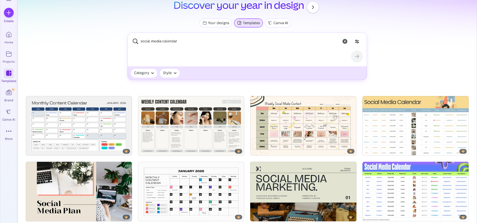 Canva is best known as a design tool, but it can also be used to create a visual content calendar for planning and presentation purposes. Teams can either design a bespoke calendar from scratch or browse Canva’s library of social media calendar templates, then fill them in with planned post ideas, dates, and platforms.