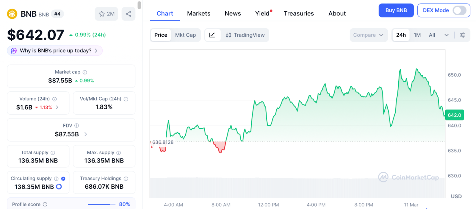 BNB holds near $642 with a $90 billion market cap, the strongest position among exchange tokens thanks to Binance’s global volume dominance, according to CoinMarketCap.