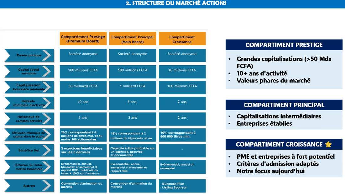 - Capitalisation minimale : 100 millions FCFA, contre 1 milliard sur le marché principal ;