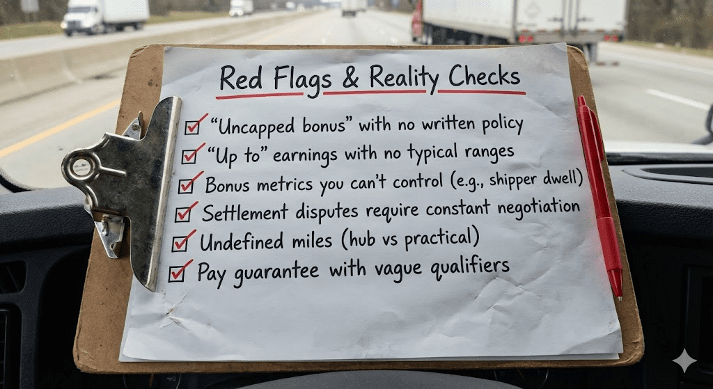 Bring them back to the settlement: ask for the pay component list (accessorials, bonus triggers, miles method) and any pay guarantee conditions.