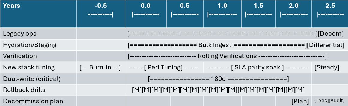 • Shadow writes or dual-write for the critical set until 90-day parity soak ends.