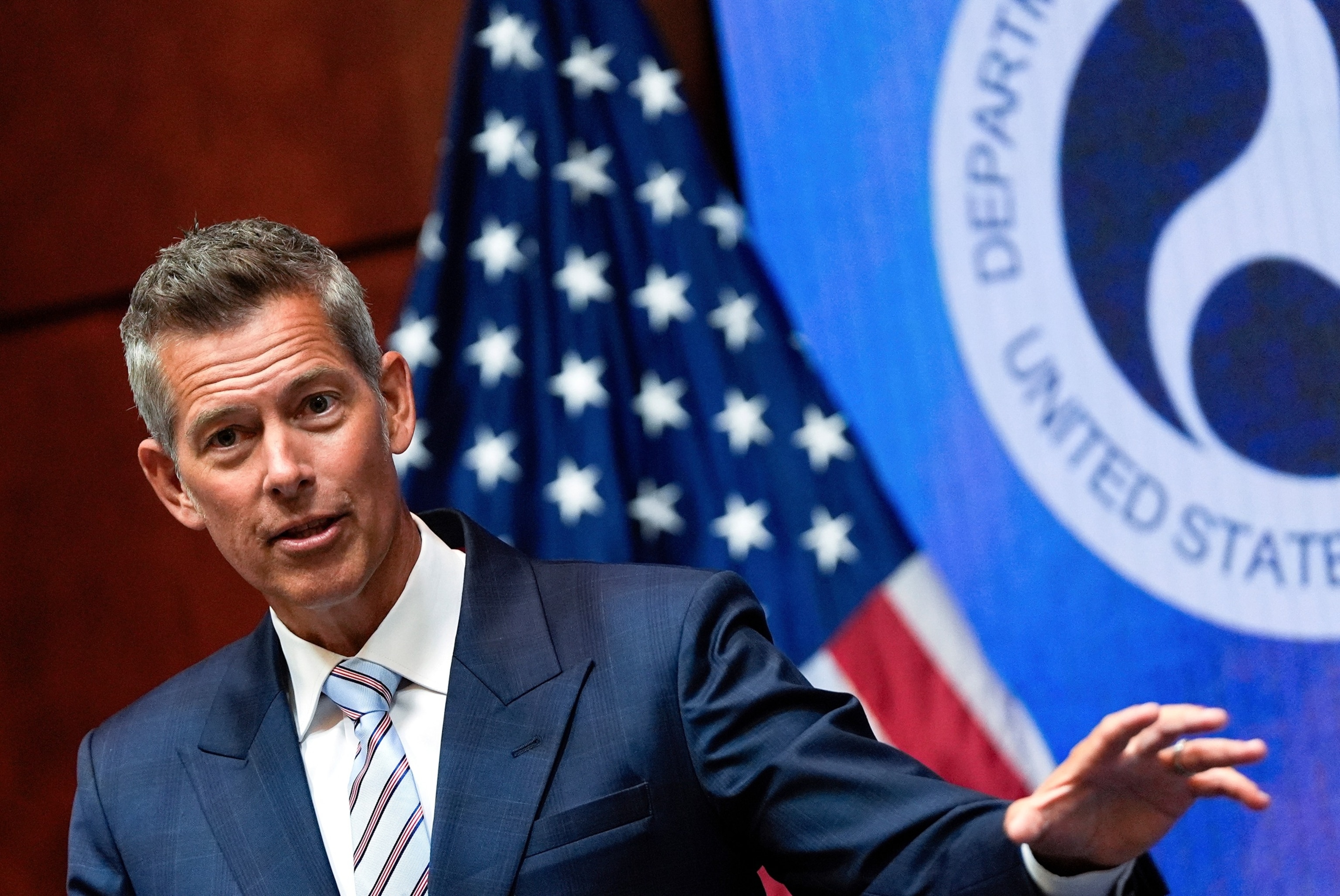 In this Aug. 5, 2025, file photo, Transportation Secretary Sean Duffy speaks during a press conference at the Department of Transportation in Washington, D.C.