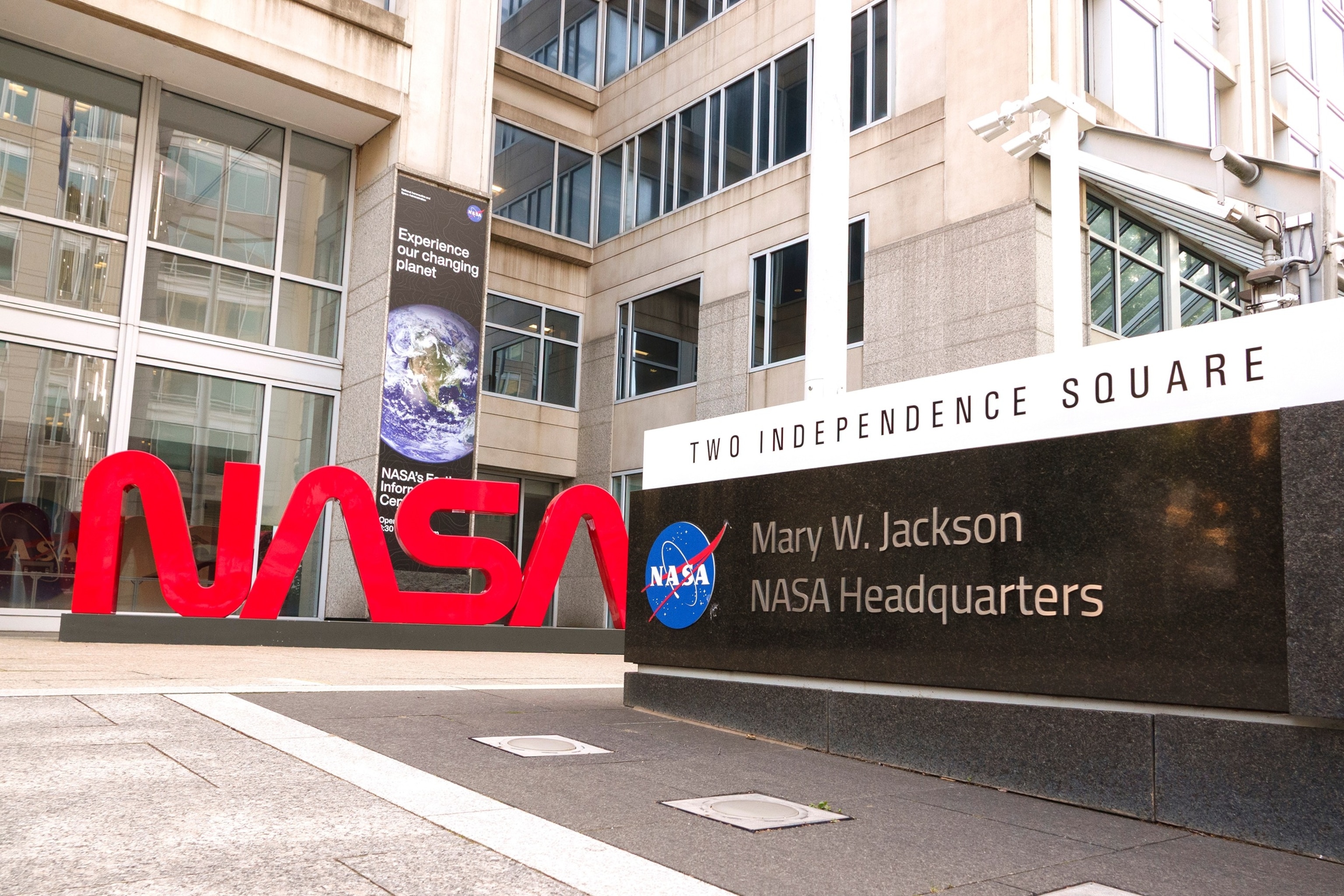 A NASA logo is displayed at the entrance to the Mary W. Jackson NASA Headquarters building on June 2, 2025, in Washington, D.C.
