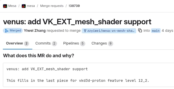 Previous Article Venus Vulkan Driver Lands Mesh Shader Support In Mesa 26.0 Venus Vulkan Driver Lands Mesh Shader Support In Mesa 26.0
