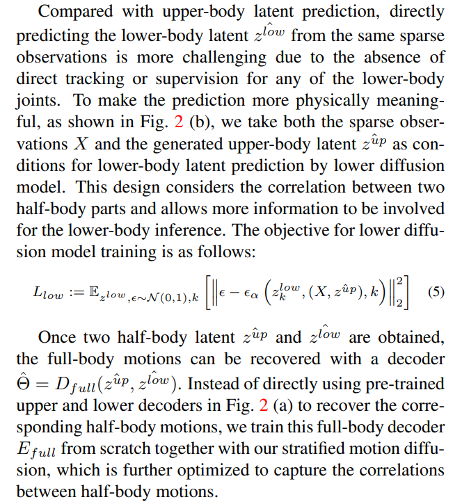 Although disentangling the full-body motions into upper and lower parts enhances effectiveness and efficiency for motion representation learning, it’s crucial to include the correlation between two body parts during generation. Otherwise, severe inconsistency would be witnessed in reconstructed full-body motions. To this end, we propose Stratified Motion Diffusion to sample upper-body and lowerbody latent in a cascaded manner with explicit considerations of the correlations mentioned above.