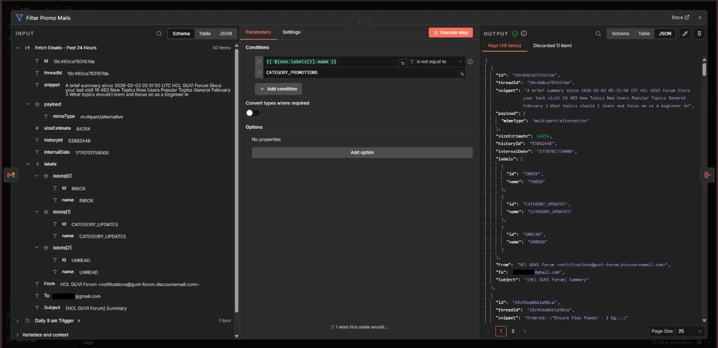 Unwanted emails, such as ads and newsletters, are removed. This improves summary quality and reduces noise. I used a Filter node to exclude emails that have the label: CATEGORY_PROMOTIONS