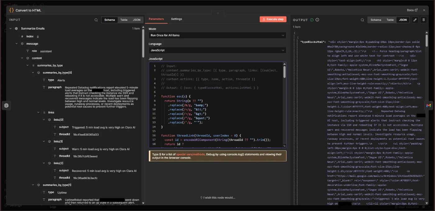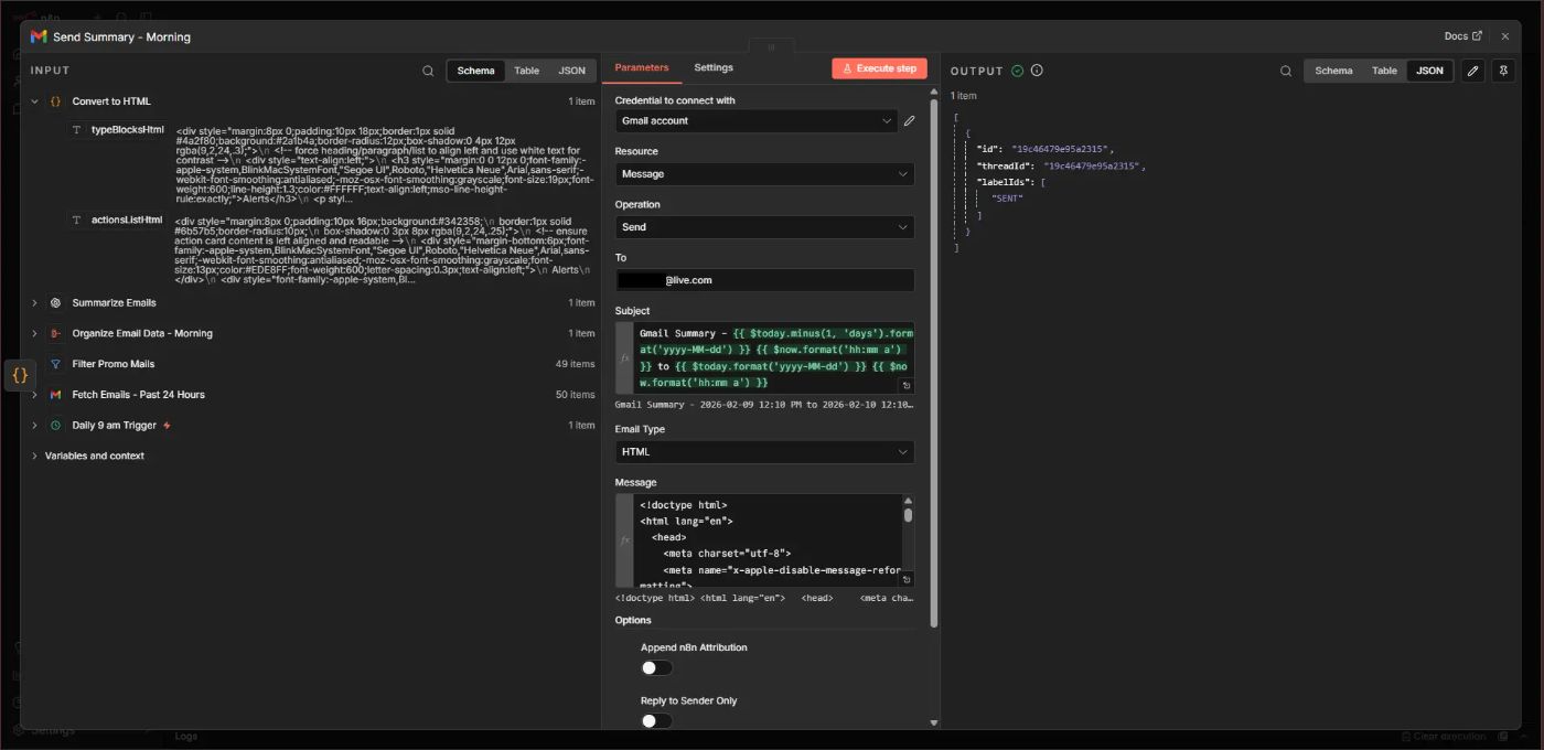 Using the “Send a Message” action of the Gmail node, the well-formatted HTML summary is sent to your inbox. You receive one clear summary with everything you need.