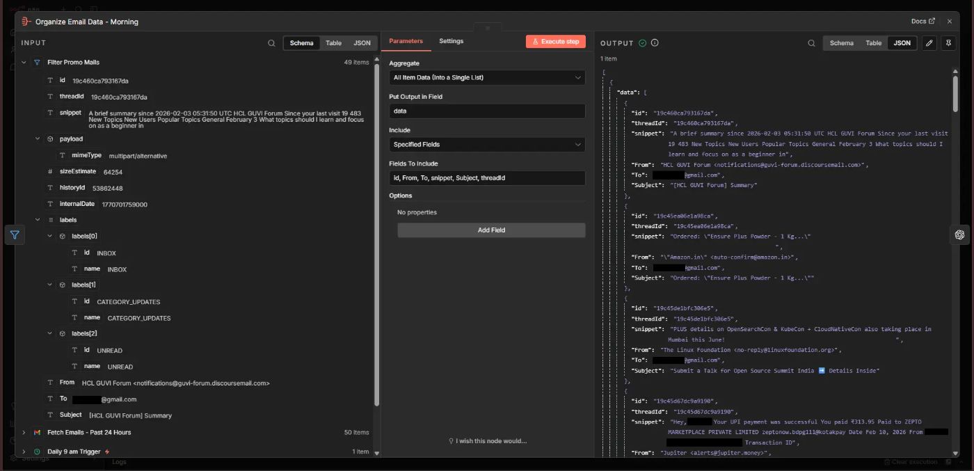 Next, an Aggregate node is used to extract important details like id, From, To, snippet, Subject, threadId into a single list. These fields are useful for later nodes.