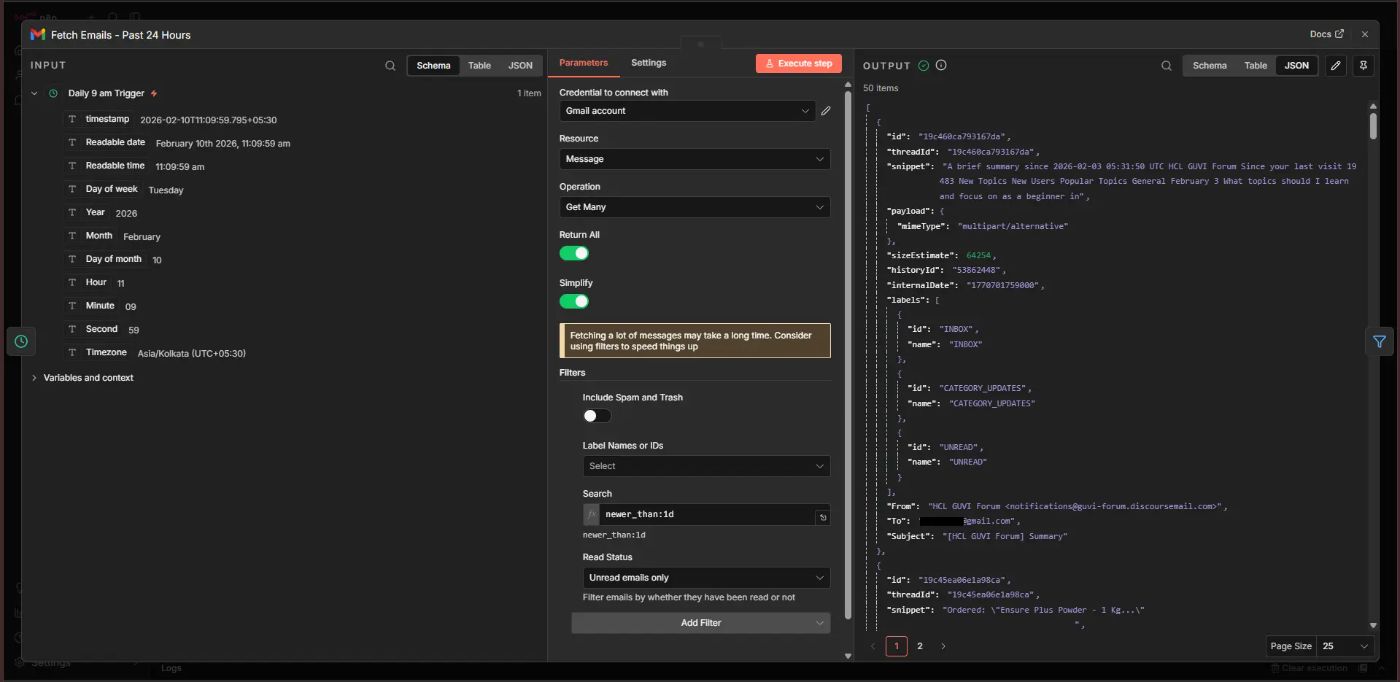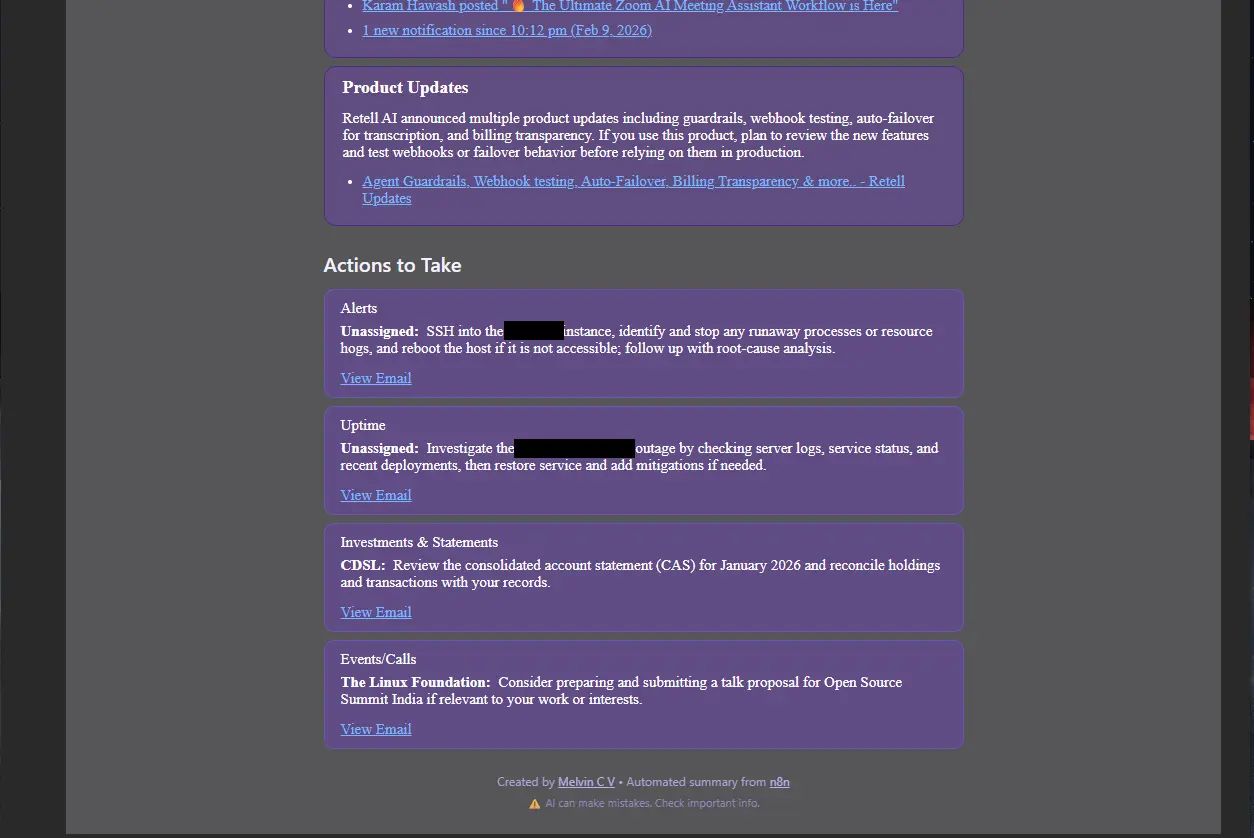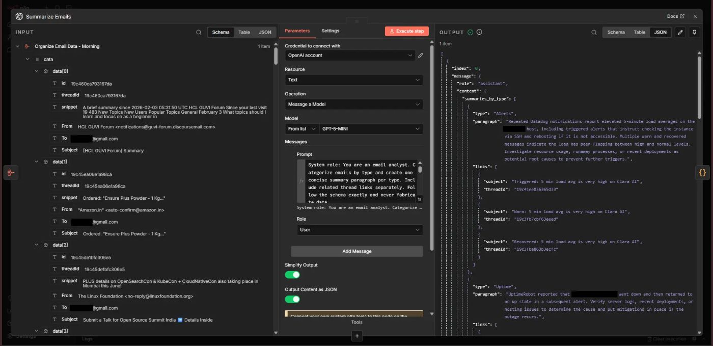 It gets unread emails for the past 24 hours, removes spam and promotional mail, analyses content using an OpenAI node, creates a category-wise summary and sends it to an email id of your choice. The summary also highlights action items under the “Actions to Take” section.