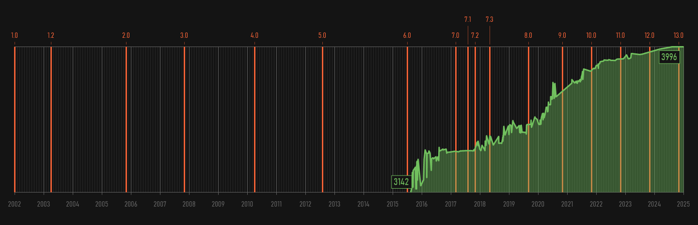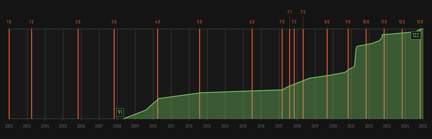 According to the official chronicle, C# has had 17 revisions up to the time of writing this article. It’s interesting to note that the first seven versions (up to and including the sixth) span a period of 13 years, while the remaining ten were released in just 8 years: