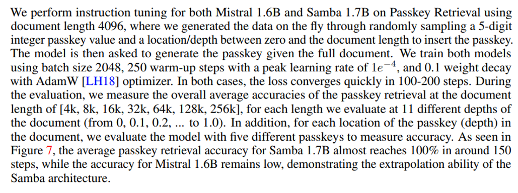 Although Samba demonstrates promising memory retrieval performance through instruction tuning, its pre-trained base model has retrieval performance similar to that of the SWA-based model, as shown in Figure 7. This opens up future direction on further improving the Samba’s retrieval ability without compromising its efficiency and extrapolation ability. In addition, the hybridization strategy of Samba is not consistently better than other alternatives in all tasks. As shown in Table 2, MambaSWA-MLP shows improved performance on tasks such as WinoGrande, SIQA, and GSM8K. This gives us the potential to invest in a more sophisticated approach to perform input-dependent dynamic combinations of SWA-based and SSM-based models.