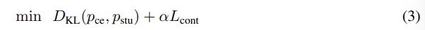 Where pce and pstu are the probabilities from the cross-encoder teacher model and our student model. α is a hyperparameter to balance the two loss functions. Lcont is the same as in Equation 1.