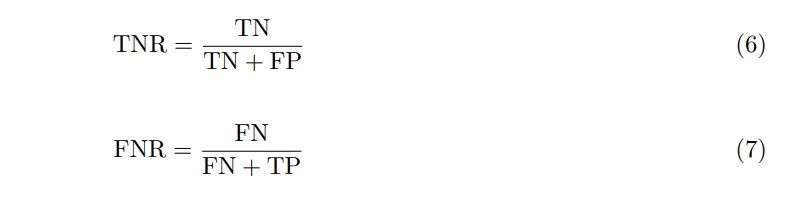 Similar to true and false positive rates, we can define two other rates focusing on negative predicted results: true negative rate (TNR) indicating the fraction of the predicted negative samples among the actually negative samples, and false negative rate (FNR) indicating the fraction of the predicted negative samples among the actually positive samples, as shown in Eqs. (6) and (7).
