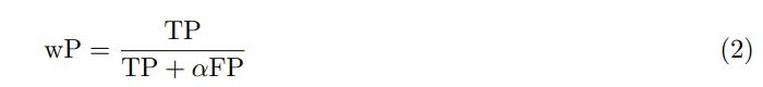 When the “natural” ratio between positive and negative samples is significantly different from the test set, it is often useful to adjust the weight of the false positives, which leads to the weighted precision (wP) defined in Eq. (2), where α > 0 is a weight determined by the ratio between the negative and positive samples.
