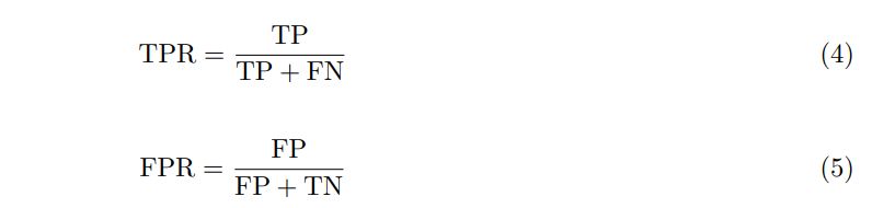 (5). In the confusion matrix, TPR is the fraction of predicted positive samples in the first row and FPR is the fraction of predicted positive samples in the second row. Note that TPR is basically a different name for recall (Eq. (3)).