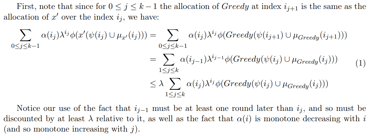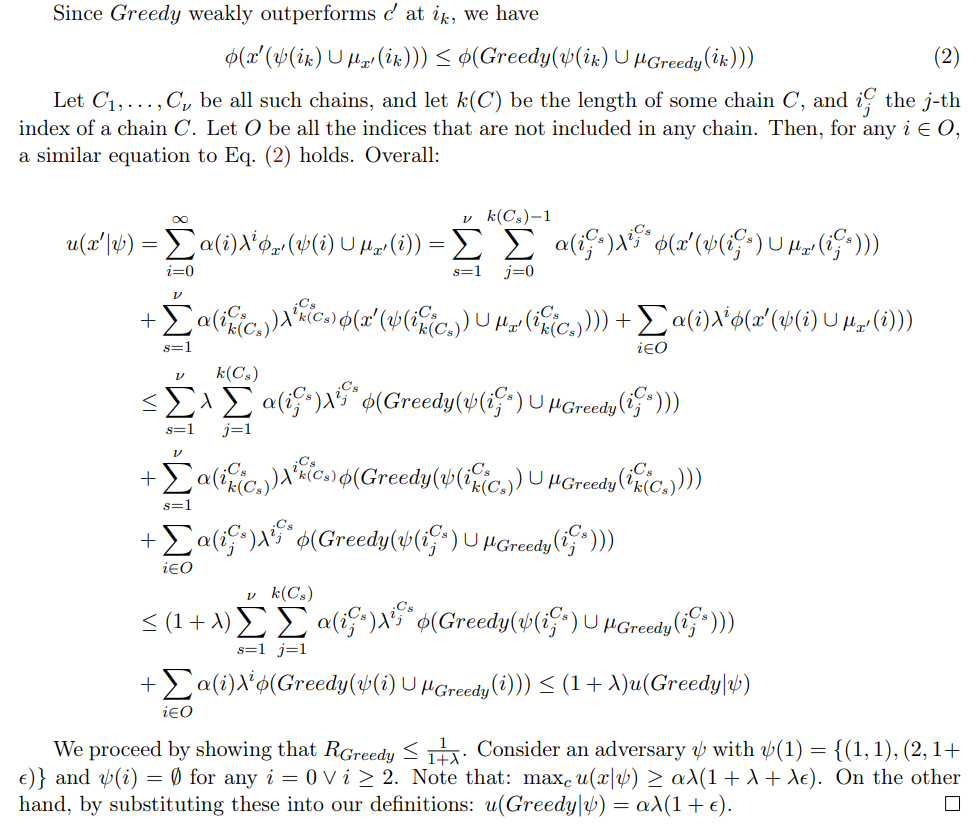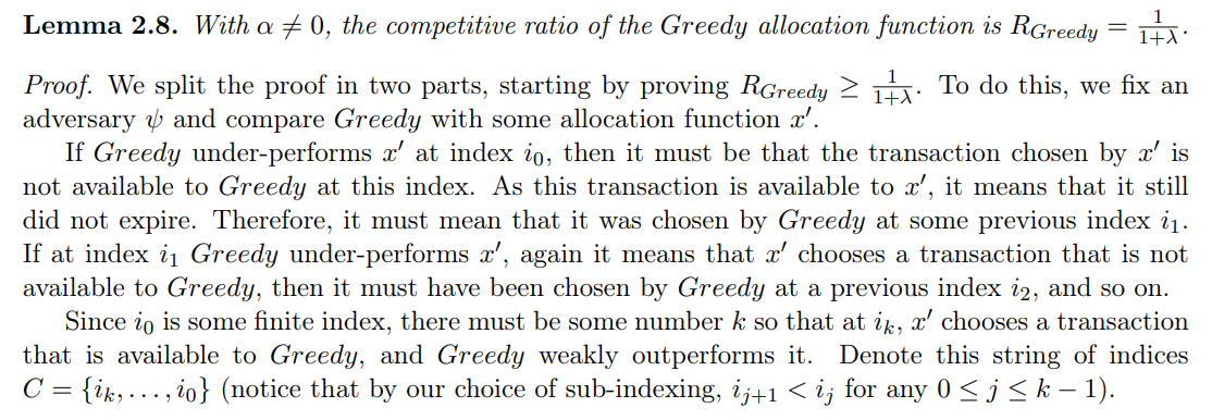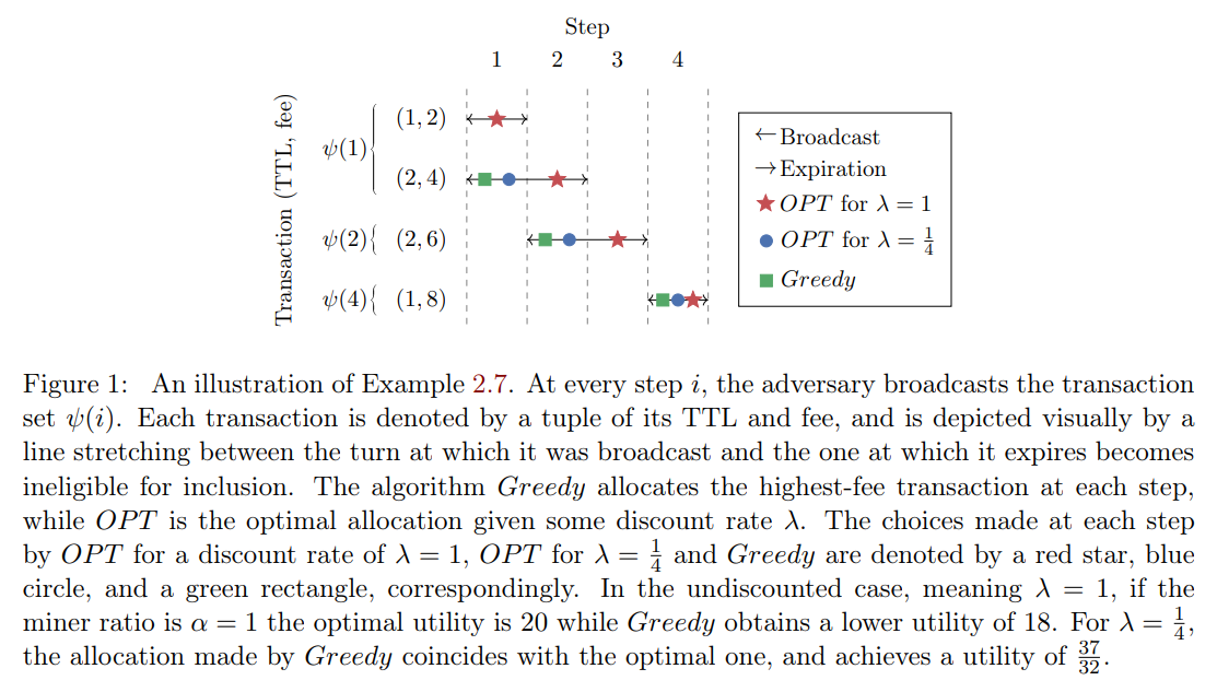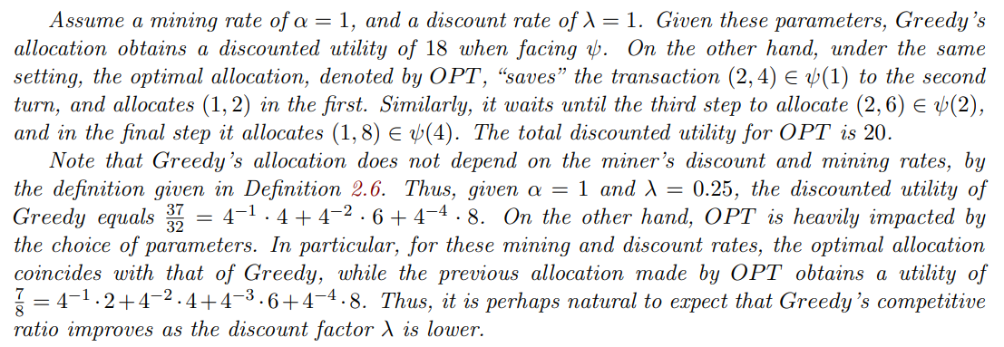 We examine a game between an adversary and a miner. This perspective aims to quantify how much revenue the miner may lose by the miner’s incomplete knowledge of future transactions when allocating the currently known transactions to the upcoming block. In this regard, the users active in the system can be thought of as an adversarial omniscient “nature”, that creates a worst-case transaction schedule. An allocation function has no knowledge of future transactions that will be sent by the adversary, and so optimal planning based on the partial information that is revealed by previous transactions may not be the best course of action. However, somewhat surprisingly, we later show that it is in fact so. Given a miner’s discount rate, there is a conceptual tension between including transactions with the largest fee and those with the lowest TTL. Thus, the quality of an allocation function x is quantified by comparing it to the best possible function x′, when faced with a worst-case adversarial ψ. The resulting quantity is called x’s competitive ratio. To remain compatible with the literature on packet scheduling, we define the competitive ratio as the best possible offline performance divided by an allocation function’s online performance, rather than the other way around, and so we have Rx ≥ 1. An upper-bound is then attained by finding an allocation function that guarantees good performance, and a lower-bound is attained by showing that no allocation function can guarantee better performance.