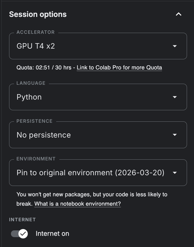 To start, go to Kaggle.com, create a free account, and create your notebook. In the sidebar, make sure the “Internet” toggle is on and “Session options” are set up to run on GPU T4 x 2.