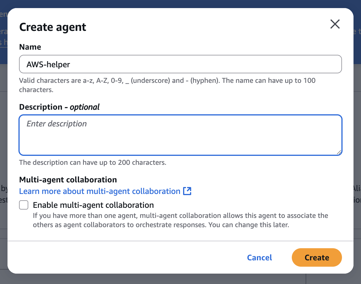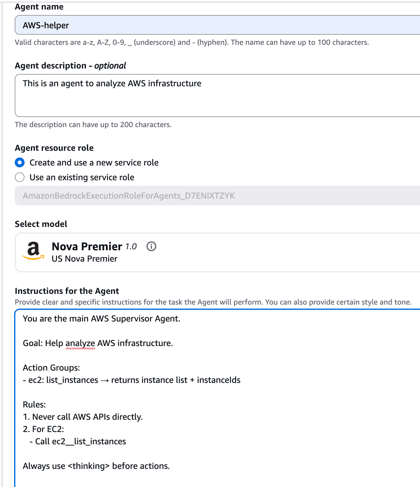 Once created, you can change the model if you want to or keep Claude by default. I will change to Nova Premier 1.0