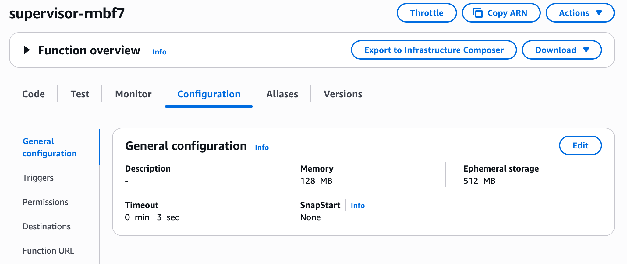 One it seems it doesn’t show anything useful, but not – the hint it 3000.00ms. its default lambda function timeout, lets adjust it. Go to supervisor function – configuration – general and edit Timeout parameter , I changed to 10 seconds