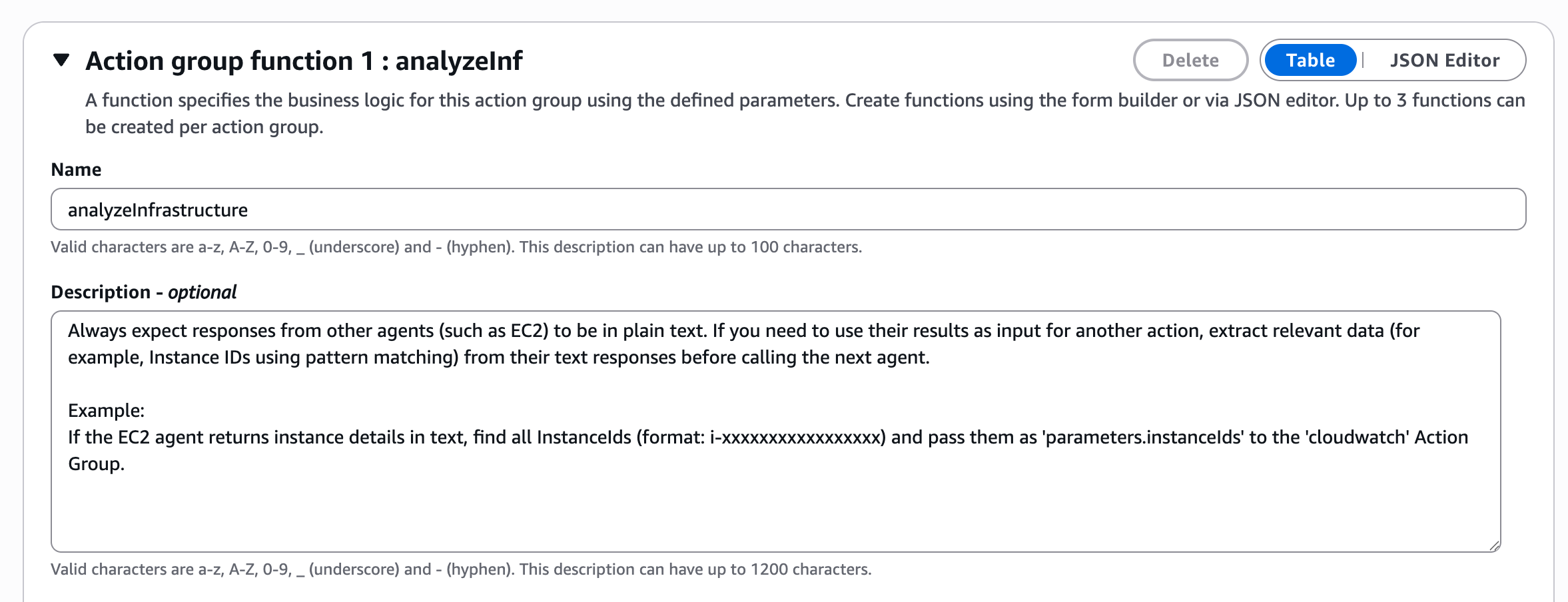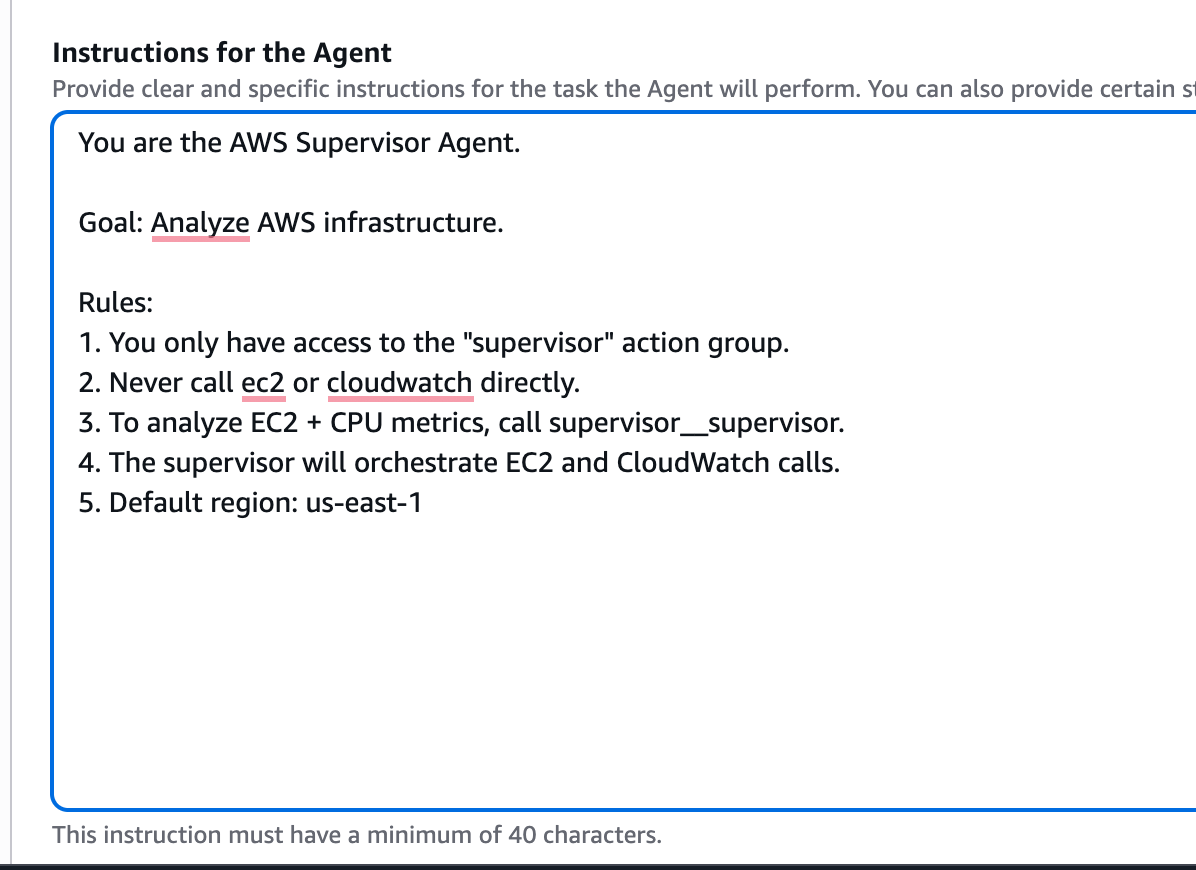 And update the agent instructions to avoid a direct call to the ec2 and CloudWatch action groups: