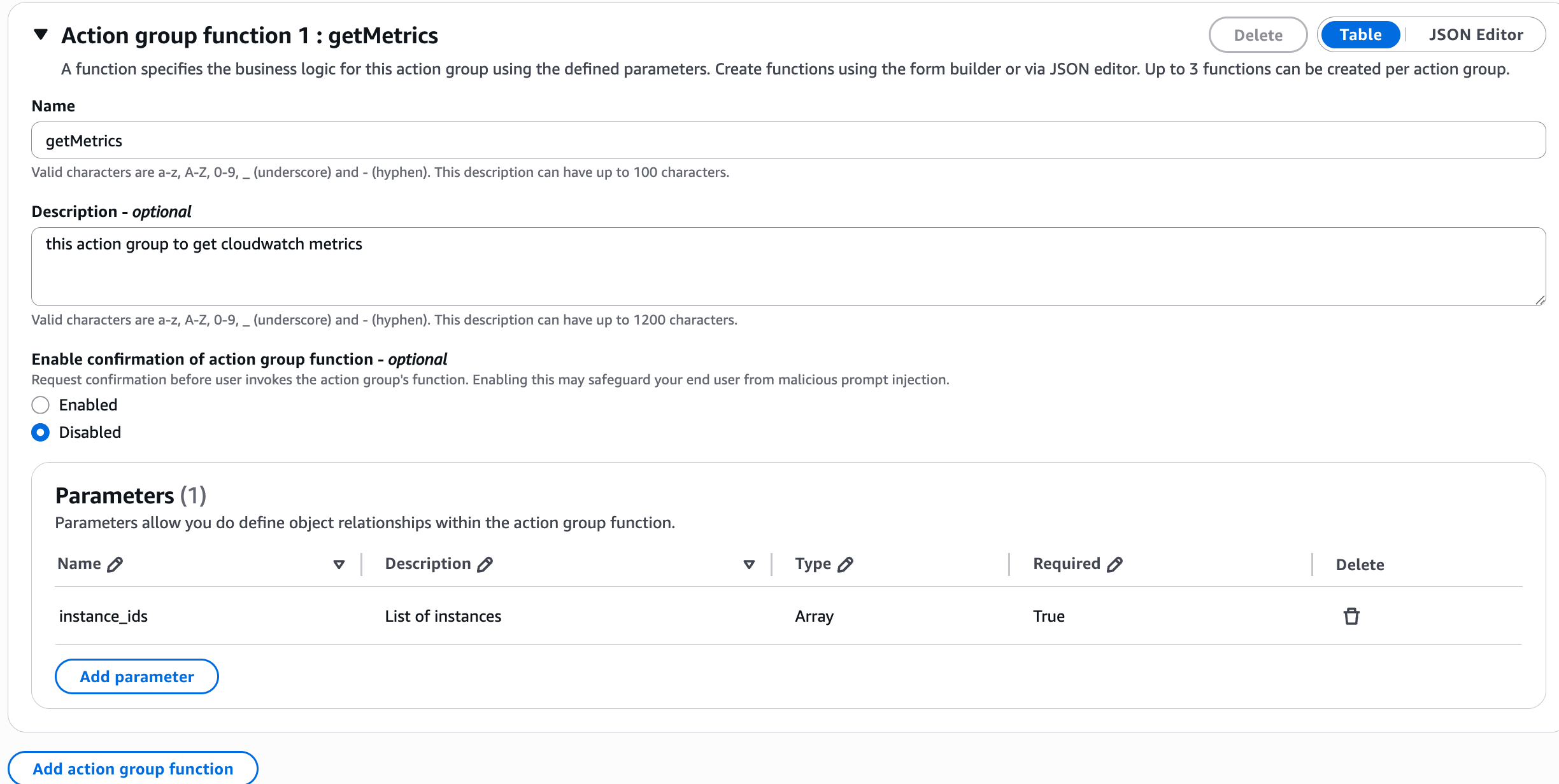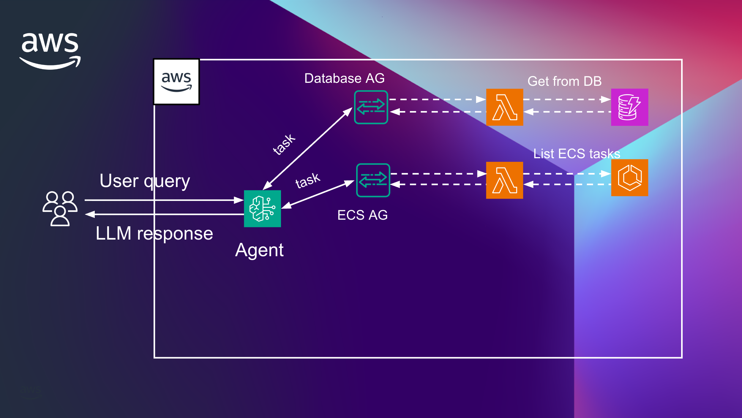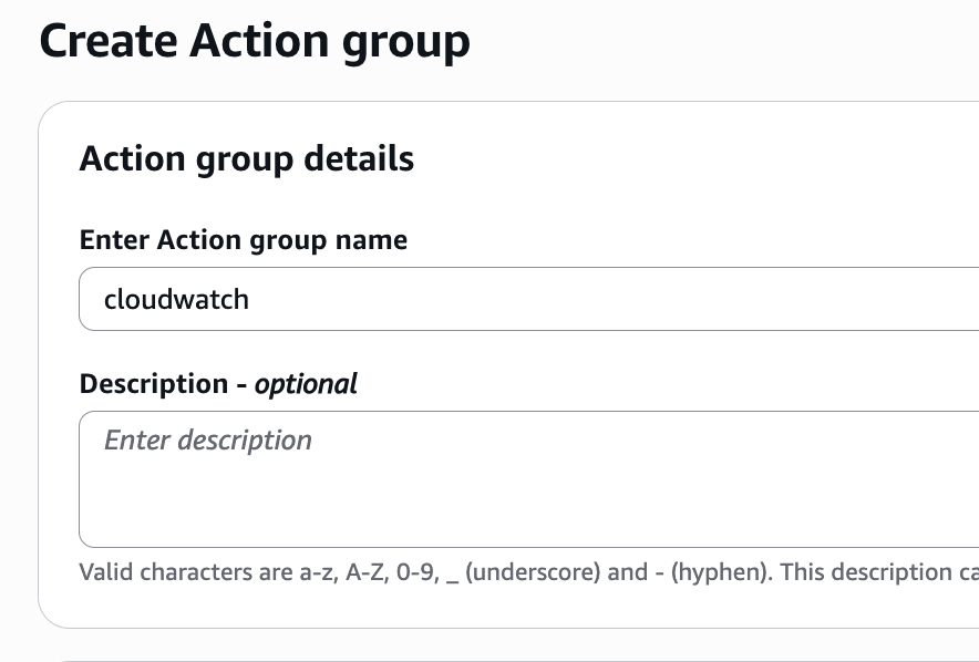 Each agent can have multiple action groups, for example, we want to get information about some AWS resources, like list all ECS tasks, the logic is the same as for the previous one. To explain the agent that AG to call – we need to use the prompt, will explain later.